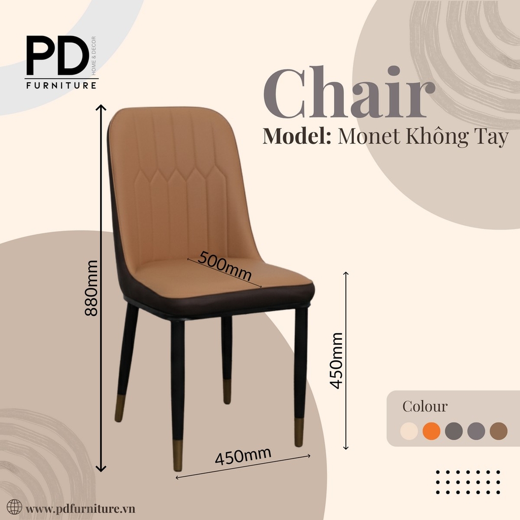 Ghế Ăn Monet không tay Nhập Khẩu nguyên chiếc Bọc Da Pu, Chân Sắt sơn đen lì tĩnh điện. Phần lưng và mặt ghế bọc da mang lại cảm giác êm ái cho người ngồi. Đặc biệt nệm ghế dày dặn kết hợp với phần lưng ôm trọn tạo sự thoải mái khi ngồi lâu.
