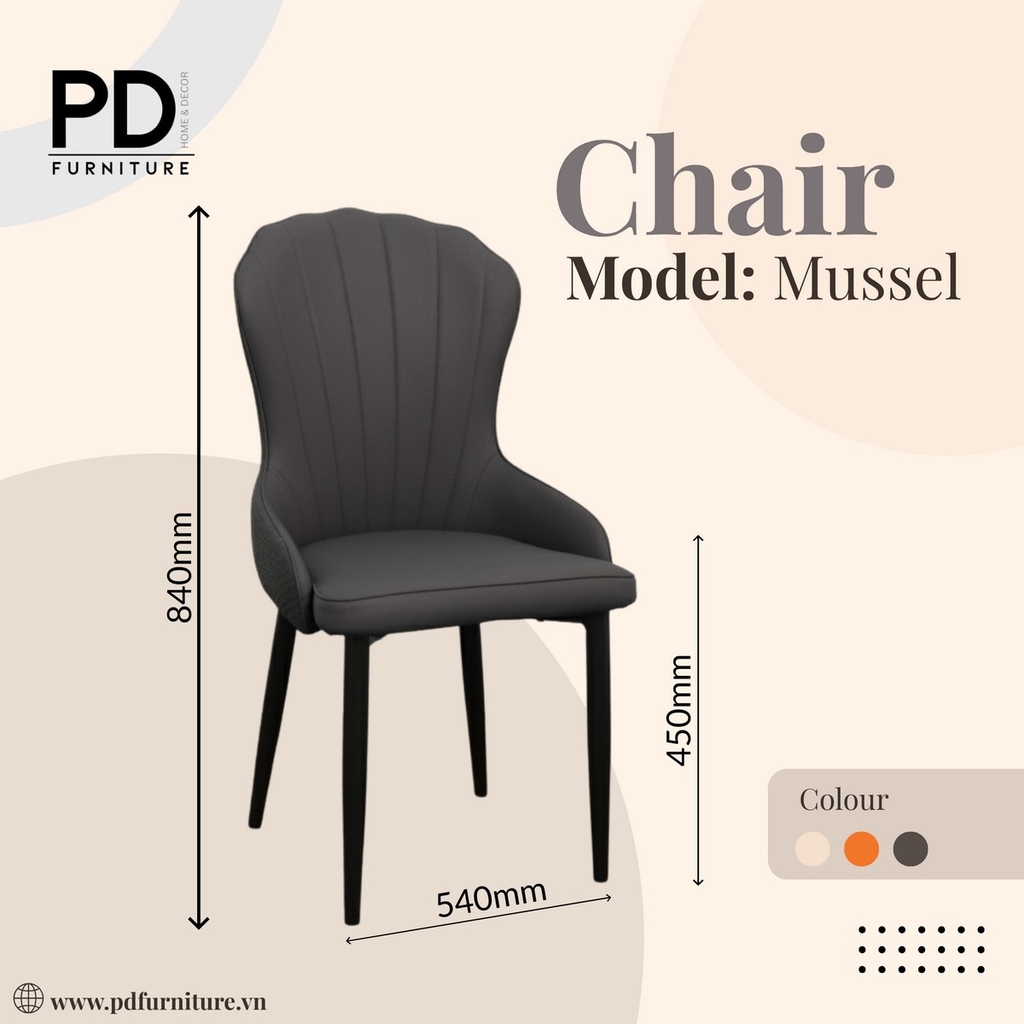 Ghế Ăn Mussel Nhập Khẩu nguyên chiếc Bọc Da Pu, Chân Sắt sơn đen lì tĩnh điện. Phần lưng và mặt ghế bọc da mang lại cảm giác êm ái cho người ngồi. Đặc biệt nệm ghế dày dặn kết hợp với phần lưng ôm trọn tạo sự thoải mái khi ngồi lâu.